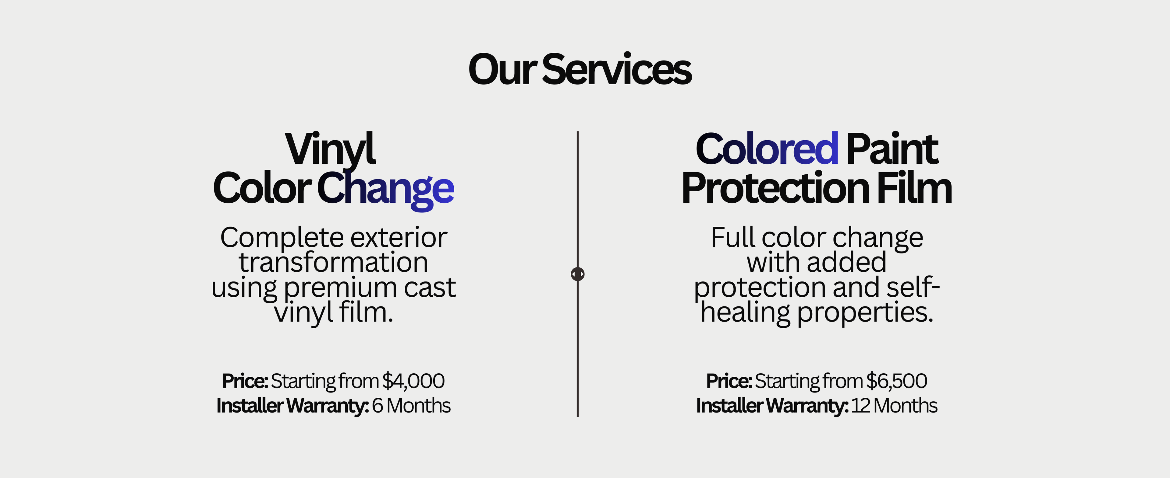 We focus exclusively on full vehicle color-change projects to maintain consistency and quality.